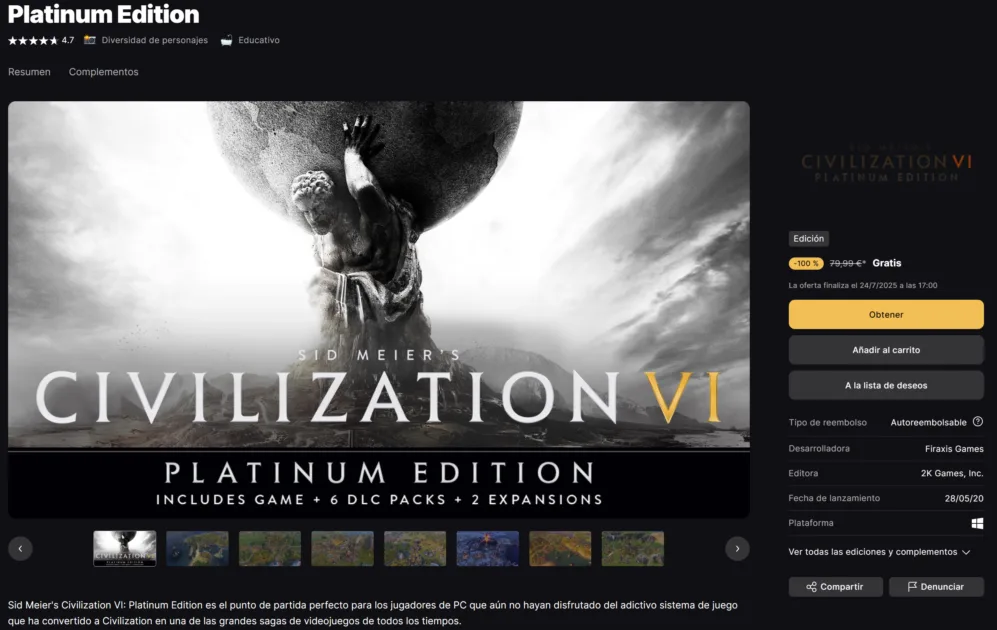 Civilization VI Platinum Edition gratis en Epic Games desde el 17 de julio. Incluye expansiones y contenido adicional. ¡Corre a descargarlo!